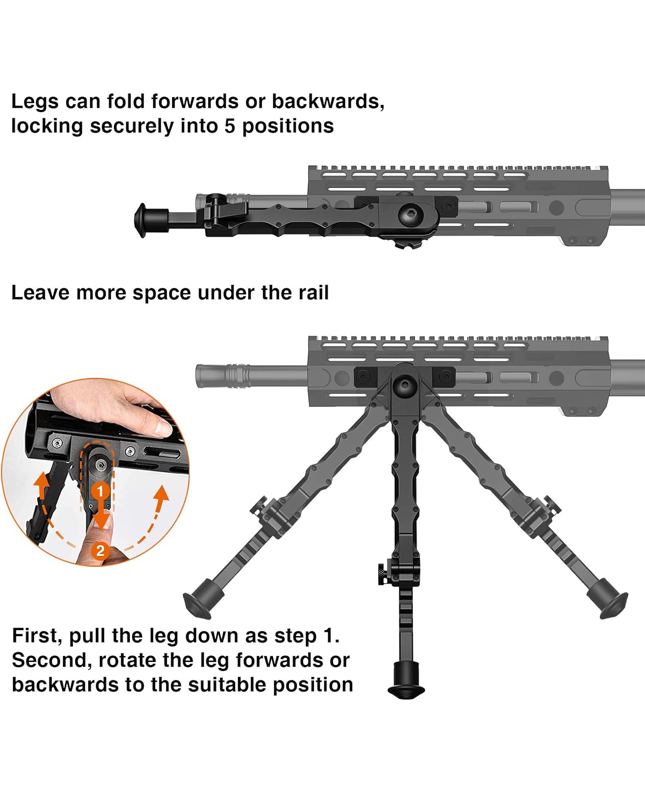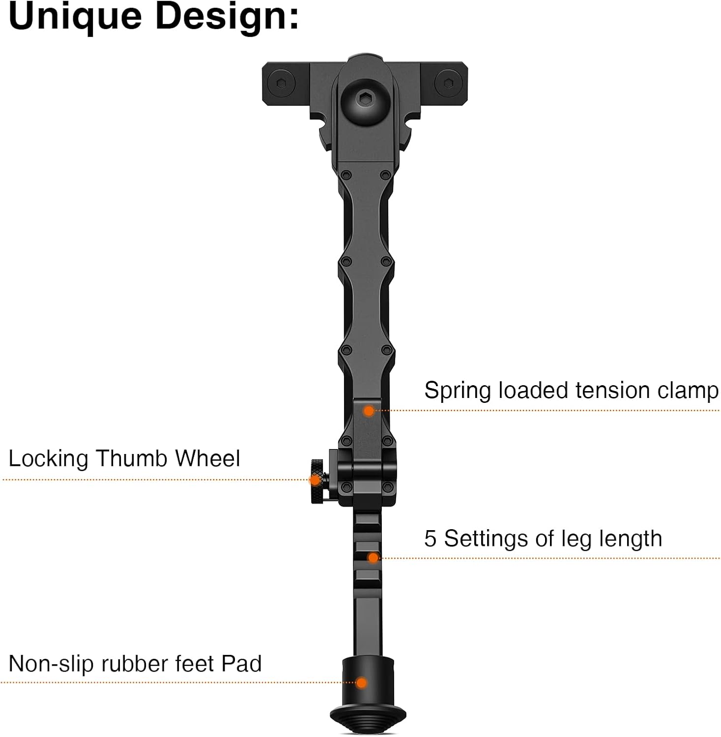 • Easy to Carry: The bipod legs have 5 fixed locking positions and can be folded forward and backward for easy portability